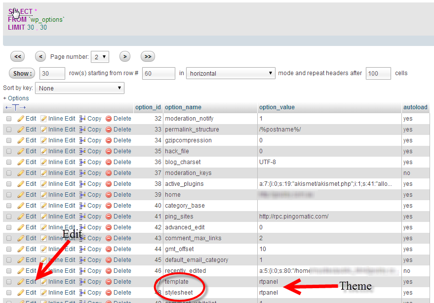 You need to edit the field named template. See it circled below? The current theme title is on the right where the arrow says "theme" in this case it is 'rtpanel'. To reset your site we are going to set the theme to one called twentyten.