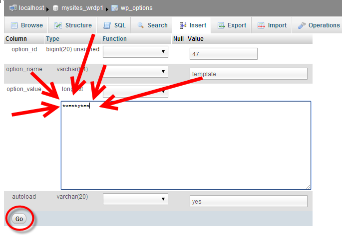 Remember I said the database was like folders with bits of paper with information? Now you are editing one of those pieces of paper. Change the name of your current theme (circled) to twentyten. Yes exactly that, you can even copy and paste it twentyten